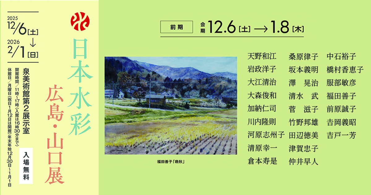 展覧会 展覧会 開催中の企画展 日本水彩 広島・山口展 2025年12月6日(土)~2026年2月1日(日)前期:2025/12/6㈯~2026/1/8(水) 後期:2026/1/9(木)~2/1㈰ 予定している企画展 中国新聞 読者の写真 2025 ―年間賞と月間賞 2026年2月7日(土)~2026年3月8日(日) 開催中の企画展 近代絵画の巨匠たち 2025年12月6日(土)~2026年3月8日(日) 年間スケジュール これまでの展覧会